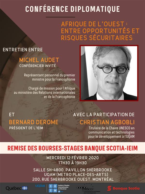 Pour cet événement, l’IEIM aura l’honneur de recevoir Michel Audet, représentant personnel du premier ministre pour la Francophonie et chargé de mission pour l’Afrique au ministère des Relations internationales et de la Francophonie. Christian Agbobli, titulaire de la Chaire UNESCO en communication et technologies pour le développement à l’UQAM, se joindra aussi à la conversation qui sera animée par Bernard Derome, président de l’IEIM.